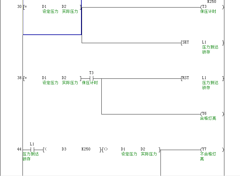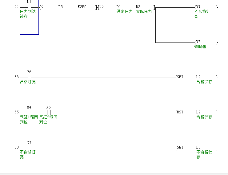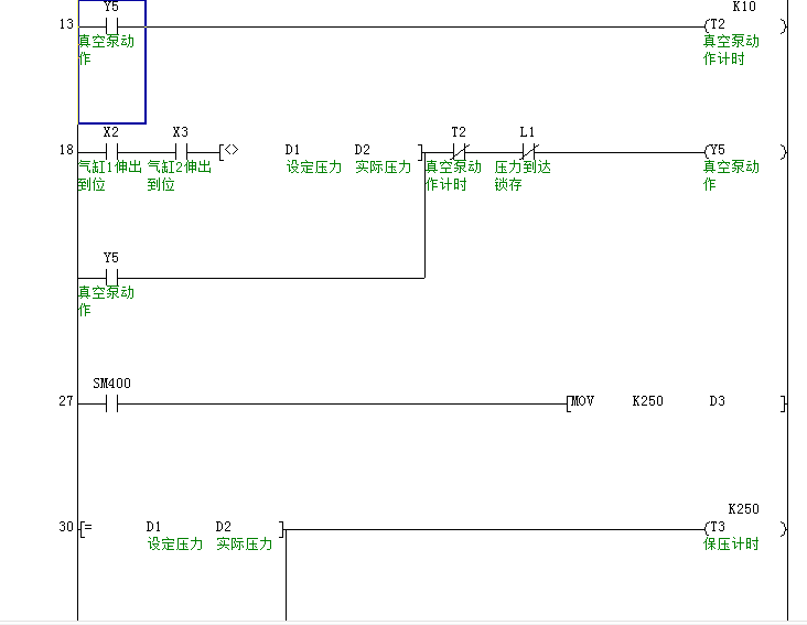 控制要求:(連體)按下開(kāi)始按鈕,由電磁閥控制的氣缸1開(kāi)始動(dòng)作(向下密封住口1),3秒后由電磁閥控制氣缸2動(dòng)作。密封好后,真空泵抽真空規(guī)定在10秒內(nèi)真空度達(dá)到設(shè)定值后停止真空泵停止抽真空(此值可由觸摸屏設(shè)定)保壓25秒,在25秒壓力值不變則合格顯示燈發(fā)亮,否則不合格燈亮并有蜂鳴器報(bào)警。無(wú)論合格與否,在顯示燈亮的同時(shí)電磁閥泄壓,只有當(dāng)壓力值小于10Pa時(shí)電磁閥控制兩氣缸同時(shí)縮回。在此過(guò)程中顯示屏記錄檢測(cè)時(shí)間,檢測(cè)數(shù)量,合格數(shù),不合格數(shù),合格率,壓力值。此信息可由USB插口傳送到其他硬盤(pán)。