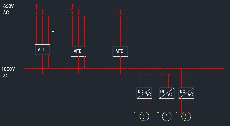 從圖紙的主回路上看的話是三個AFE并聯(lián)啊,但是有一號和2號兩臺柜子,每個柜子里面有三個AFE單元,然后1號柜和2號柜是主從連接。它們的直流母線是連起來的,預充電時是用其中一臺柜子的預充電回路給兩臺柜子直流母線同時充。