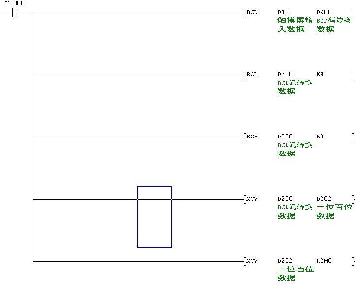 先把觸摸屏過來的數(shù)據(jù)D20用BCD指令轉(zhuǎn)換成BDC嗎 存在D200中,然后左移4位,右移8位,在吧數(shù)據(jù)傳動到D202中,在傳送到M0-M7中