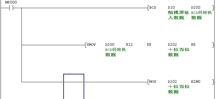 先把觸摸屏過來的數(shù)據(jù)D20用BCD指令轉(zhuǎn)換成BDC嗎 存在D200中,軟后用位移動(dòng)指令SMOV吧十位 百位移動(dòng)到D202中,在用MOV指令傳送到M0-M7中
