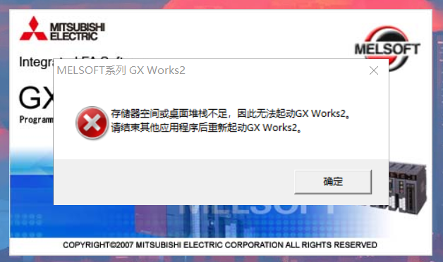 三菱GX Work2卸載后重裝,打開軟件會提示內(nèi)存不足等故障,顯示儲存器空間不足的故障,